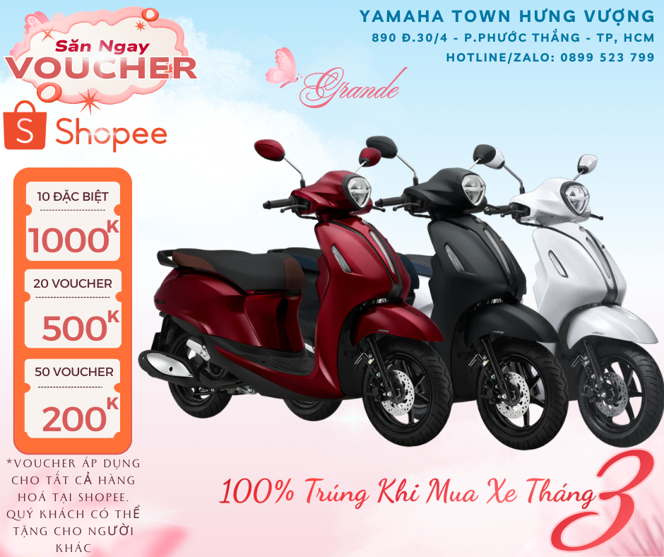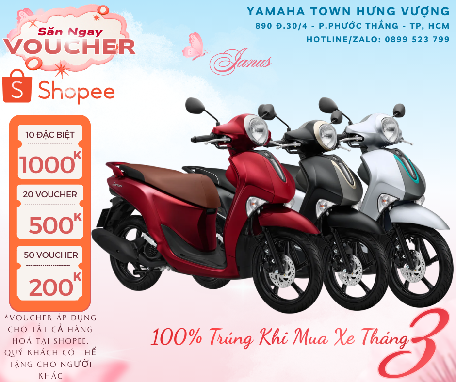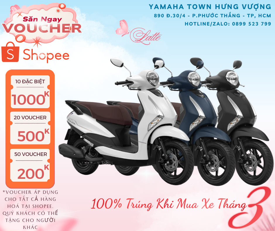 Bên cạnh những ưu đãi về giá, khi sở hữu xe tại Yamaha Town Hưng Vượng trong tháng 3 này, bạn sẽ được tham gia chương trình quay số/bốc thăm may mắn với cơ cấu giải thưởng cực kỳ hấp dẫn để thỏa sức mua sắm tại Shopee: